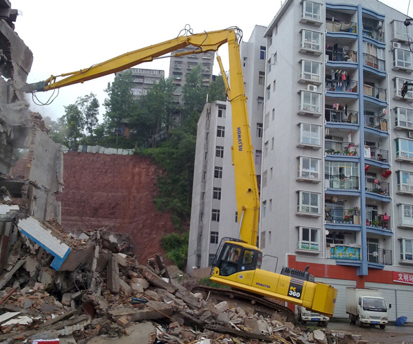 挖掘機(jī)改裝拆樓機(jī)的拆遷高度與加長臂長度相同,一般說來不建議30噸機(jī)以下挖掘機(jī)改裝拆樓機(jī)。拆樓機(jī)前端配備可以液壓剪,也可以是破碎錘,鑒于對機(jī)器使用壽命和長臂的有效保護(hù),建議使用液壓剪